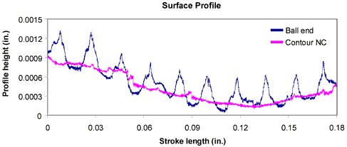 In this graph the scallop pattern of the ball end mill is clearly visible, whereas the surface machined with our technology shows no scallop marks at all. We have succeeded in reducing scallop heights to the same order of magnitude as the cutter marks. Because scallops between tool passes are usually the dominant feature on the surface, their removal requires the most hand-work. By reducing scallop marks to the same order of magnitude as the cutter marks, we are able to significantly reduce post-machining grinding and polishing.